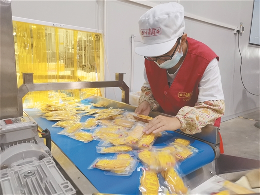 鹽津鋪子的工人正在檢查包裝好的芒果干。