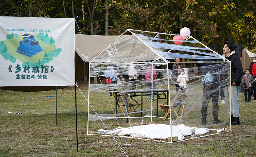 在七星公園華夏之光廣場的大草坪上,五頂白色帳篷散落各處,市民游客圍了一圈又一圈。這里正在舉行《城市的顏色-桂林:一起去桂林》參與式劇場活動,五組來自全國各地的藝術家扎起露營帳篷,在喀斯特山峰的天然布景下,5個帳篷化身5間劇場,帶來5場別具一格的演出。