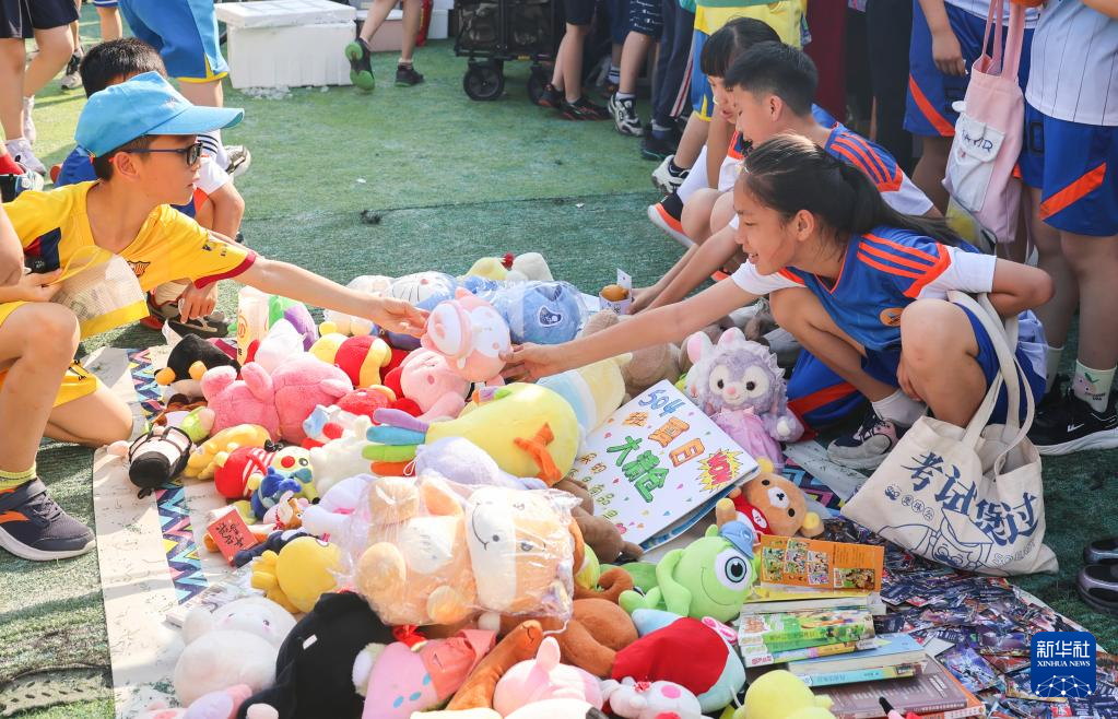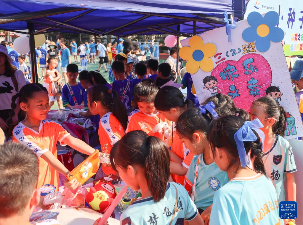 5月31日,在廣西南寧市濱湖路小學,學生在參與“紅領巾公益市集”義賣活動。