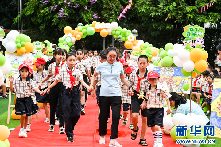 8月28日,在廣西南寧市民族大道東段小學,老師帶領學生們走過“啟程門”。