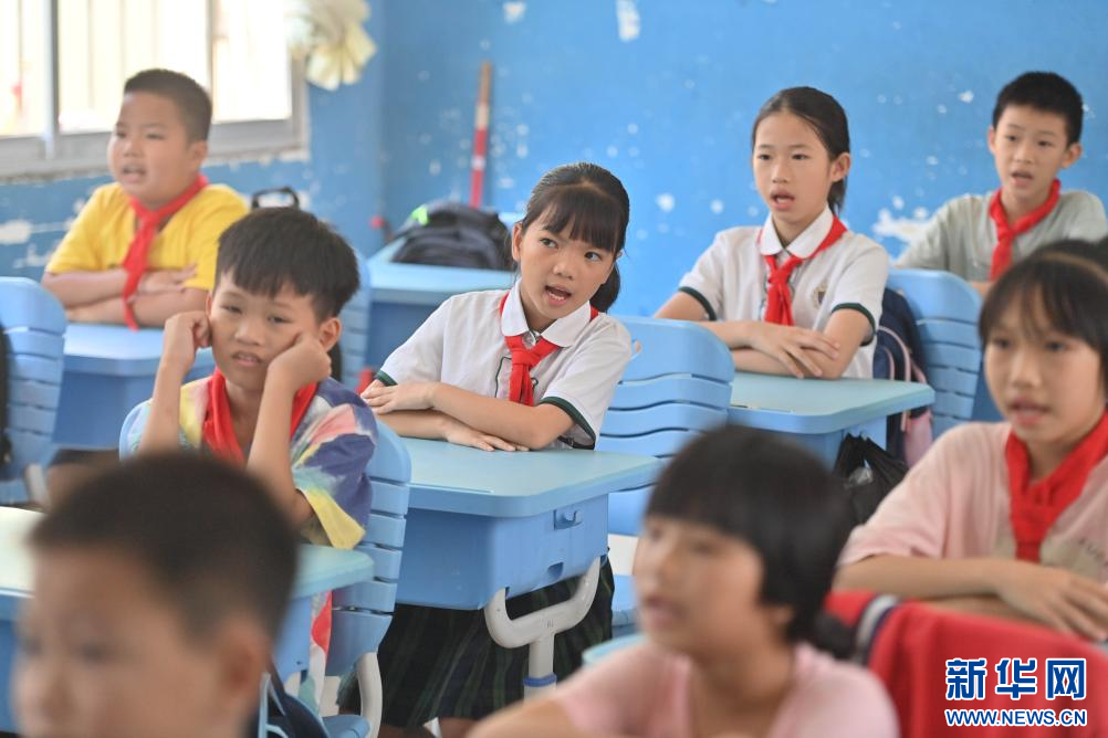 在梧州市長洲區長洲鎮泗洲小學,孩子們在跟著陳明仲學唱下俚歌(9月5日攝)。