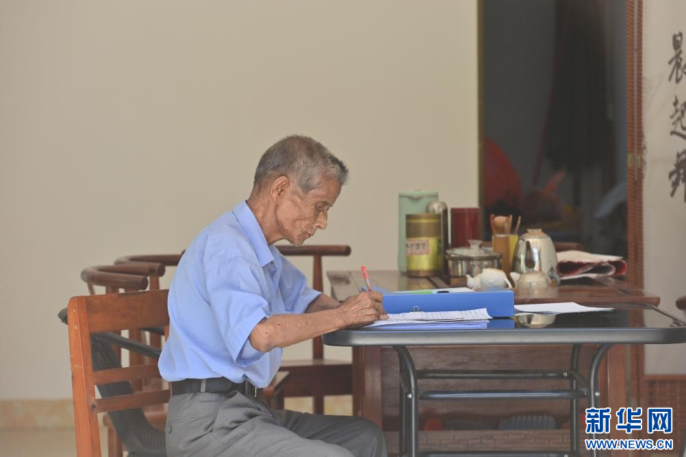 在梧州市長洲區長洲鎮泗洲村的家中,陳明仲在整理自己創作的下俚歌詞文稿(9月5日攝)。