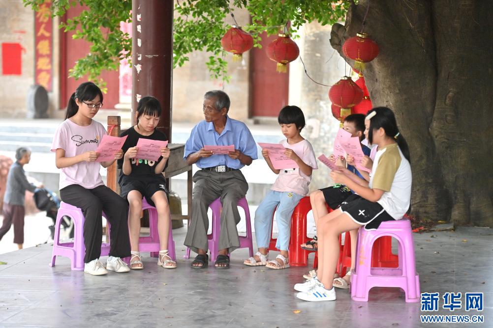 在梧州市長洲區長洲鎮泗洲村,陳明仲(左三)在教小學生唱下俚歌(8月24日攝)。