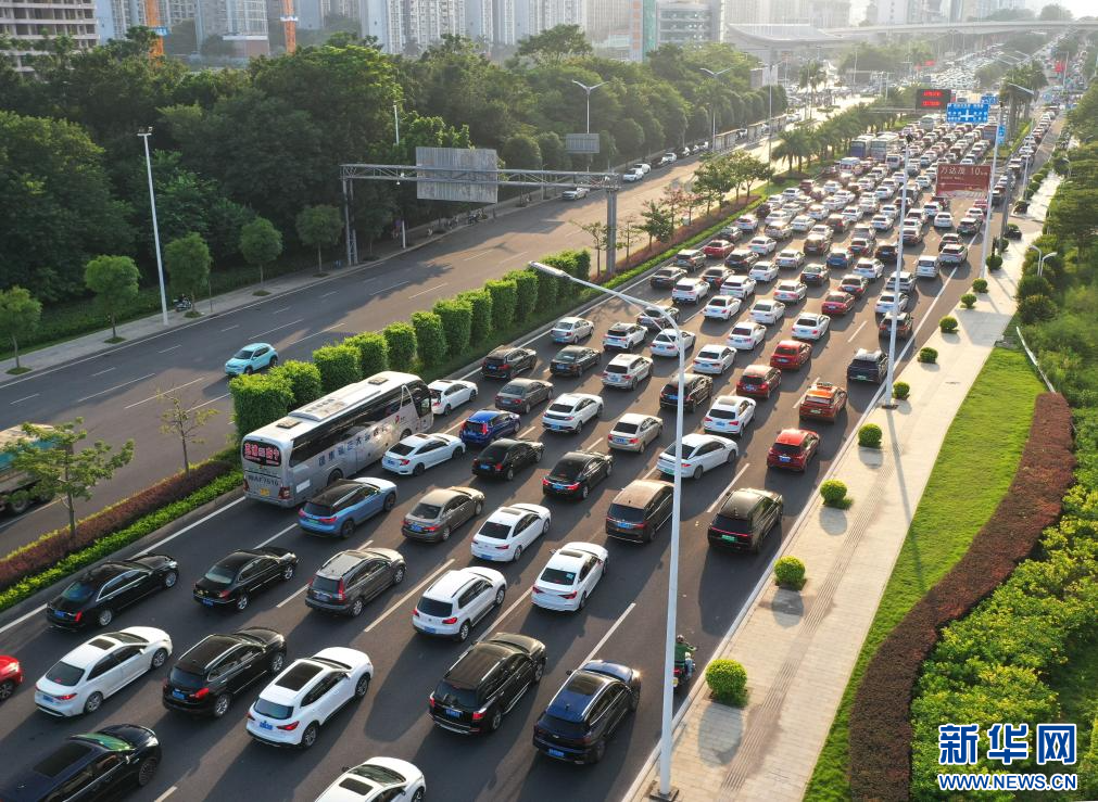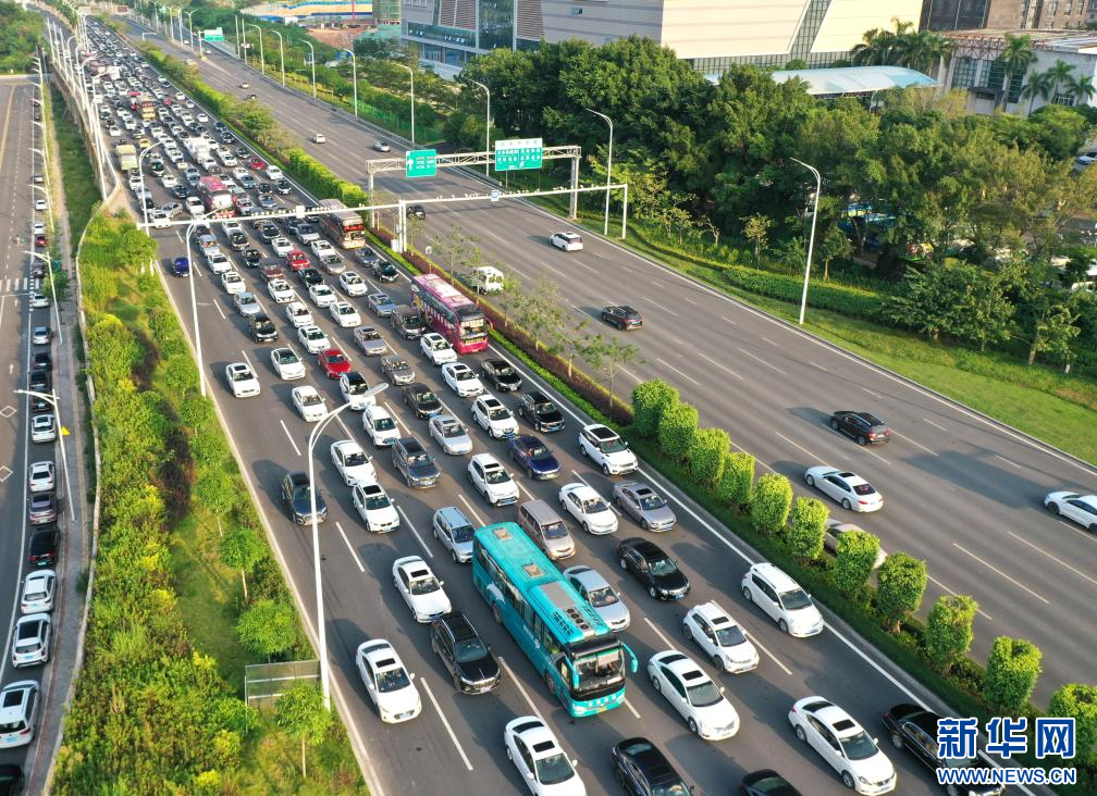 10月5日,廣西南寧市民族大道進城方向車輛排成長龍(無人機照片)。