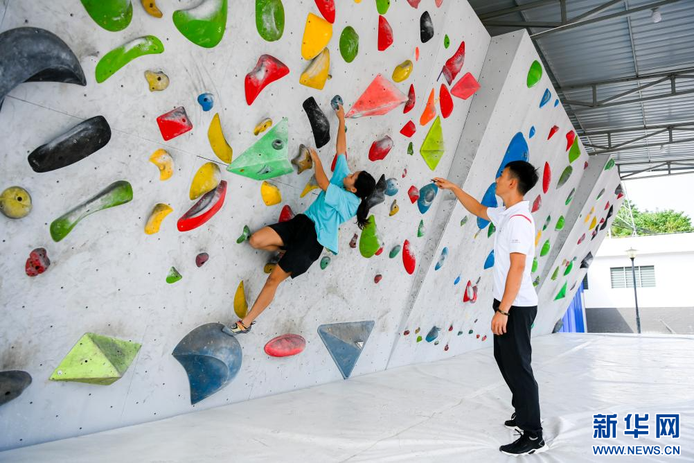 11月10日,在廣西馬山縣古零鎮初級中學,準備參加第一屆全國學生(青年)運動會攀巖項目比賽的李彥郯進行賽前熱身。