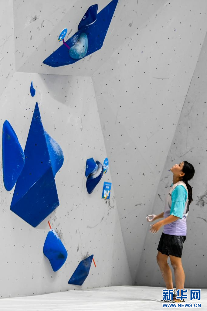 11月10日,在廣西馬山縣古零鎮初級中學攀巖館,李彥郯在第一屆全國學生(青年)運動會攀巖項目難度賽攀爬前觀察線路。