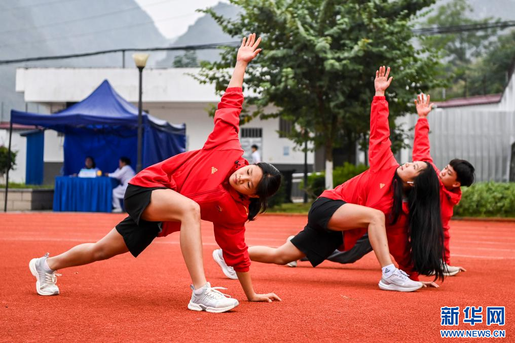 11月10日,在廣西馬山縣古零鎮初級中學,準備參加第一屆全國學生(青年)運動會攀巖項目比賽的李彥郯(左一)進行賽前熱身。