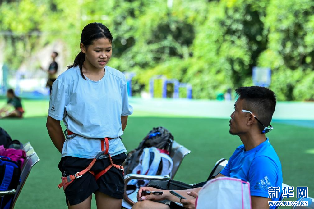 8月20日,在廣西樂業縣,李彥郯(左)在參加第一屆全國學生(青年)運動會攀巖項目預賽前參加集訓。