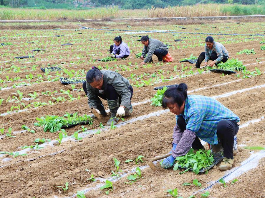 時下正值秋冬作物播種、移栽好時節。近日,在廣西壯族自治區來賓市忻城縣城關鎮上思耕蔬菜種植基地里,數十名工人正忙著搬運菜苗,移栽芥菜。