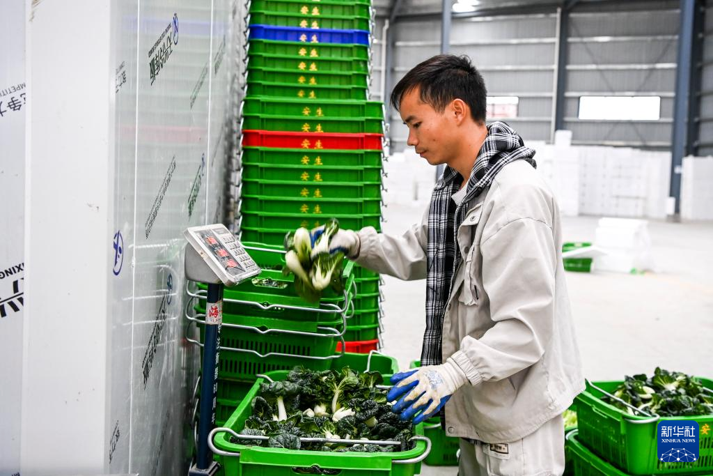 12月5日,在廣西鐘山縣一處蔬菜倉儲轉運車間,工作人員將蔬菜分類、稱重。