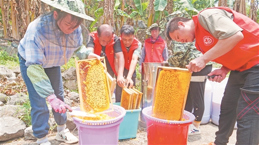 在遂意鄉朝公村,蜂農和志愿者正在割蜜。 藍春青/攝