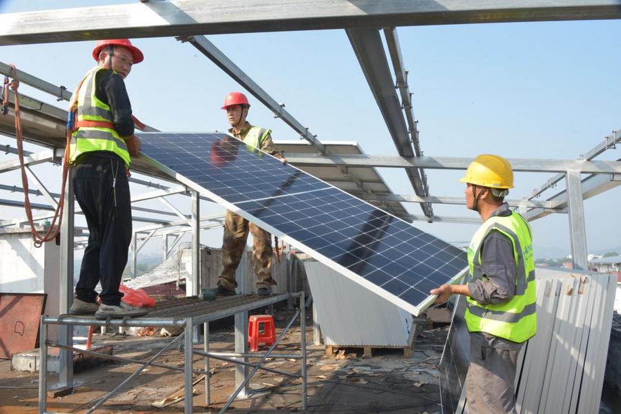 近日,在廣西合山市光熱小區屋頂分布式光伏項目施工現場,工人在屋頂上有條不紊地進行支架焊接、光伏板安裝等工作,近20棟樓樓頂上整齊排列著安裝好的光伏發電板,十分惹人注目。