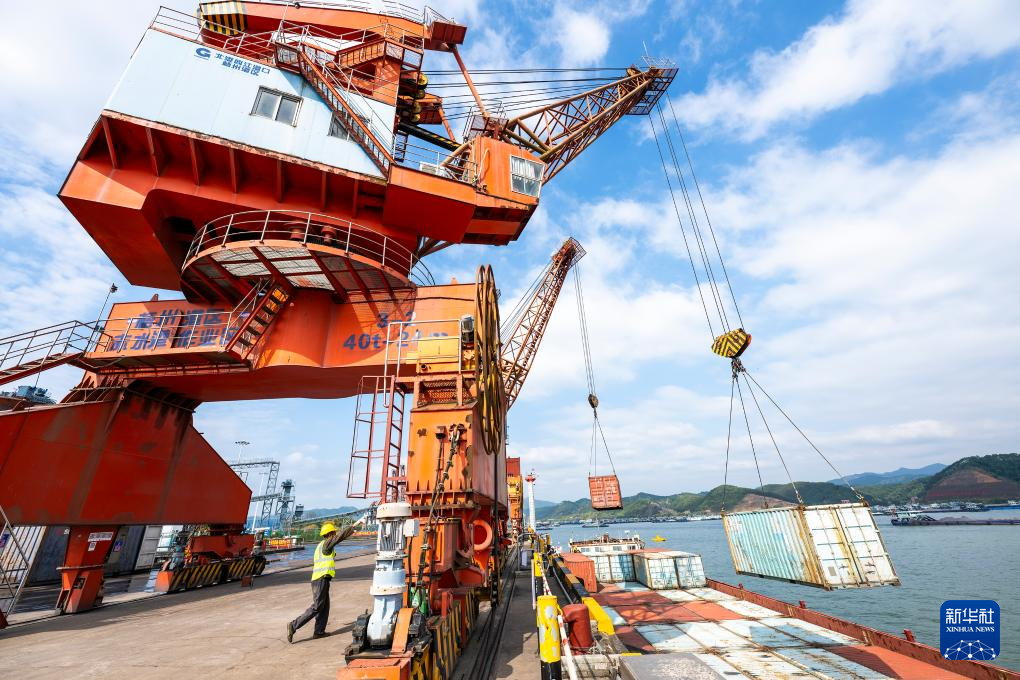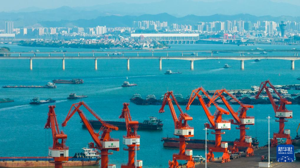 1月3日,在廣西梧州臨港經濟區赤水港碼頭,工人操作設備在碼頭上進行裝卸作業。