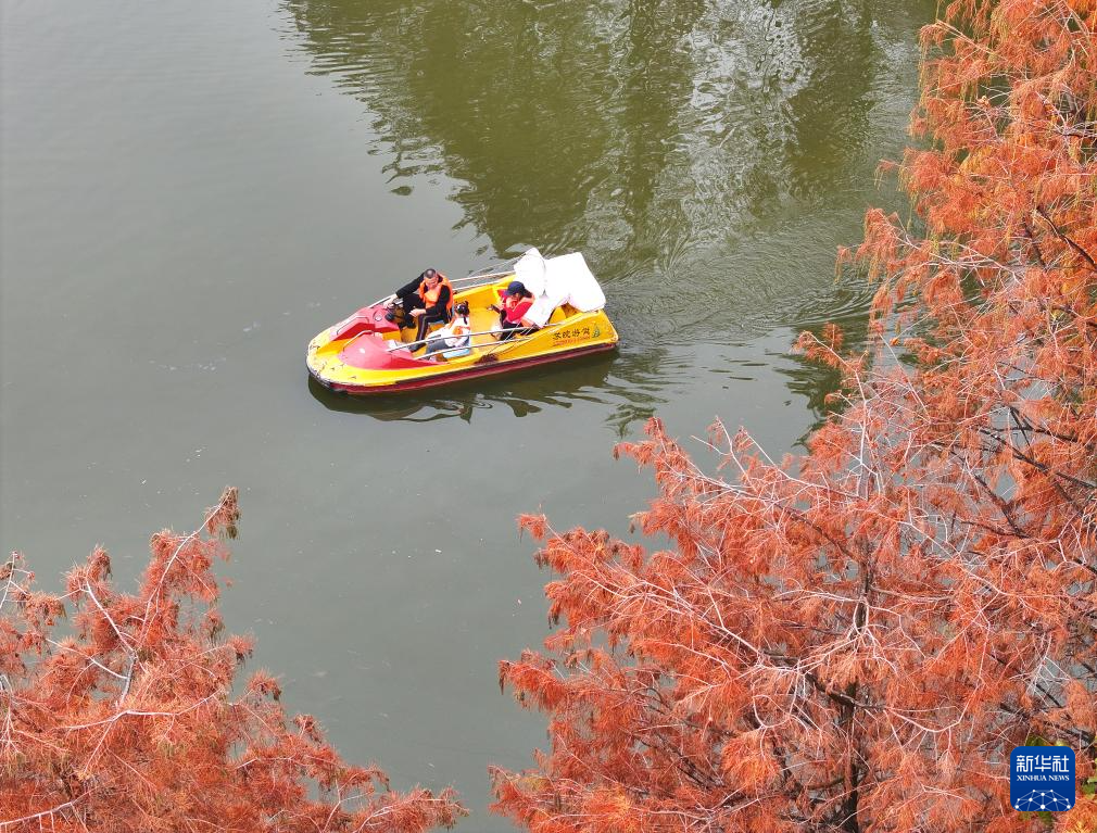 市民在廣西南寧市金花茶公園內紅艷的杉樹林旁劃船(1月6日攝,無人機照片)。