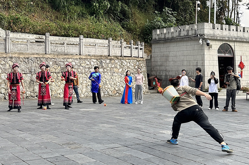當天下午,友誼關景區開展了壯族板鞋、拋繡球、跳壯族舞蹈、品嘗東南亞水果和當地特色小吃等活動,讓“老鐵們”感受南疆邊關的風情。