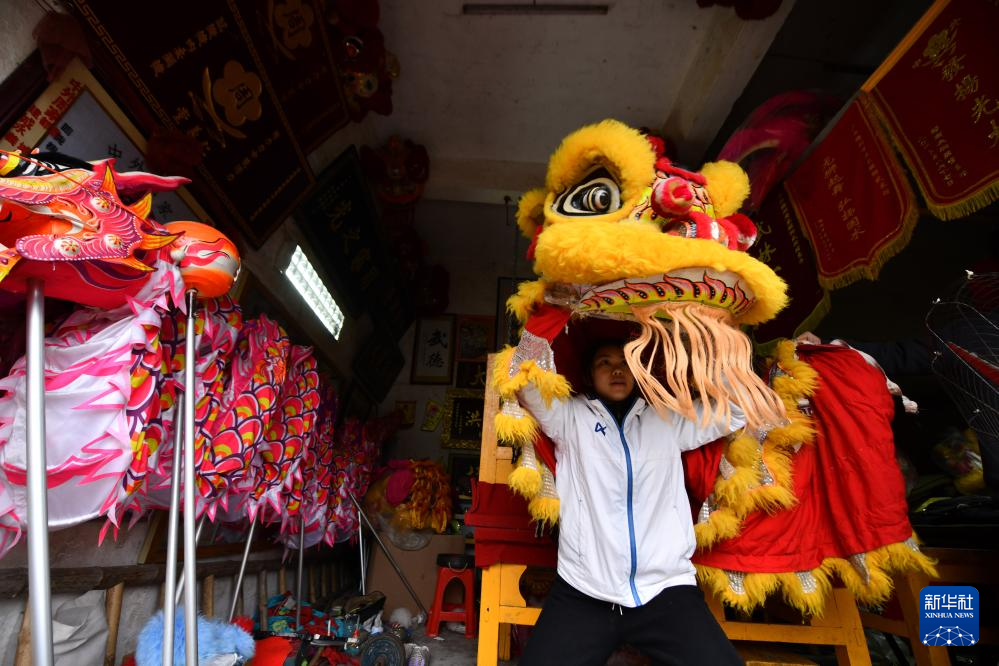 在梧州市萬秀區桂北社區周家醒獅武術館,中學生農子萱在準備排練(2月8日攝)。