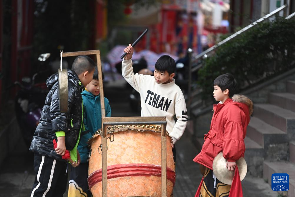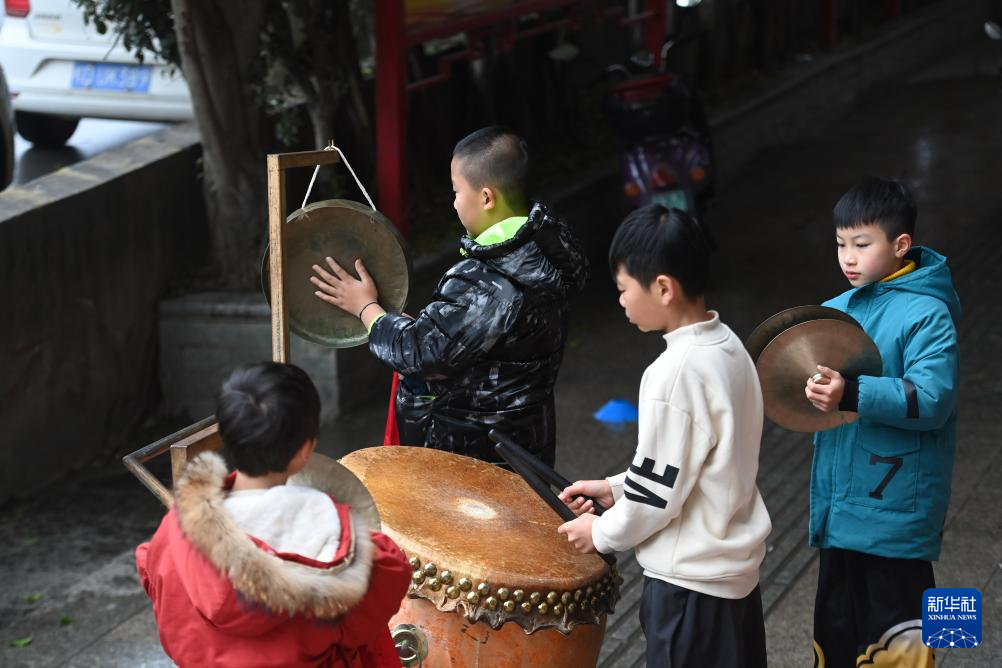 在梧州市萬秀區桂北社區周家醒獅武術館,小學生們在練習打鼓(2月8日攝)。
