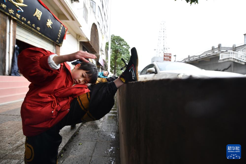 在梧州市萬秀區桂北社區周家醒獅武術館,小學生譚雯文在熱身(2月8日攝)。