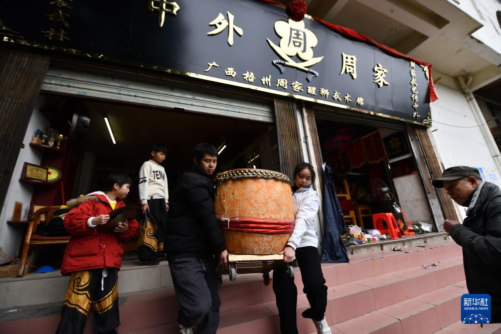在梧州市萬秀區桂北社區周家醒獅武術館,中學生農子萱(右二)和教練在搬運道具,準備排練(2月8日攝)。