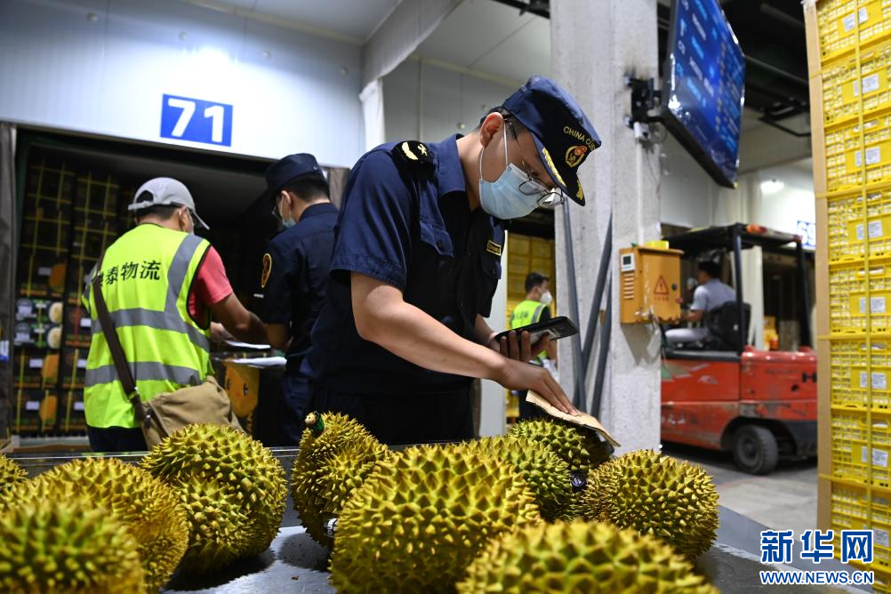 2023年9月12日,在廣西憑祥友誼關口岸,海關工作人員對進口的榴蓮進行查驗。(曹祎銘 攝)