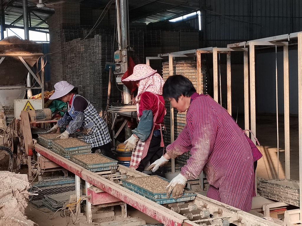 育秧廠內工人忙著出盤