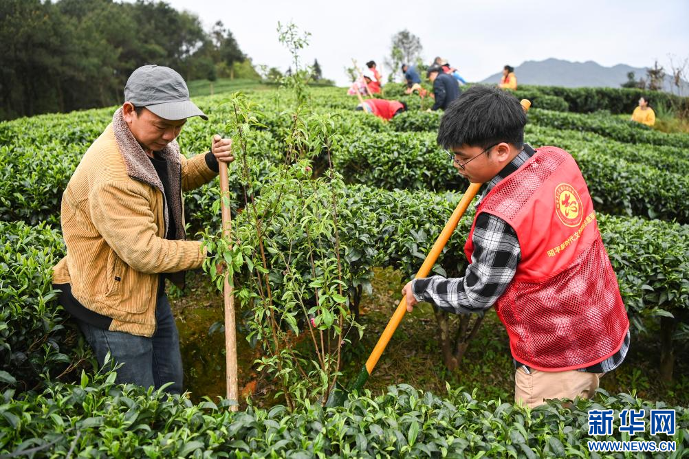 3月20日,在廣西昭平縣一處茶園,志愿者和村民一起栽種果樹。