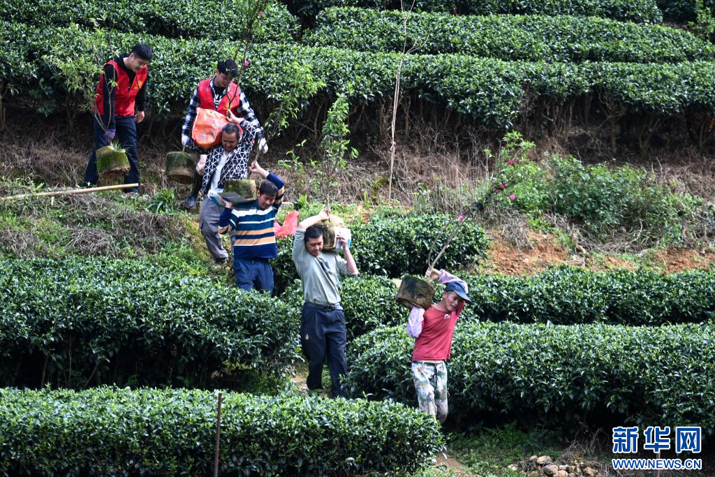 3月20日,在廣西昭平縣一處茶園,當地群眾一起搬運準備栽種的果樹苗。