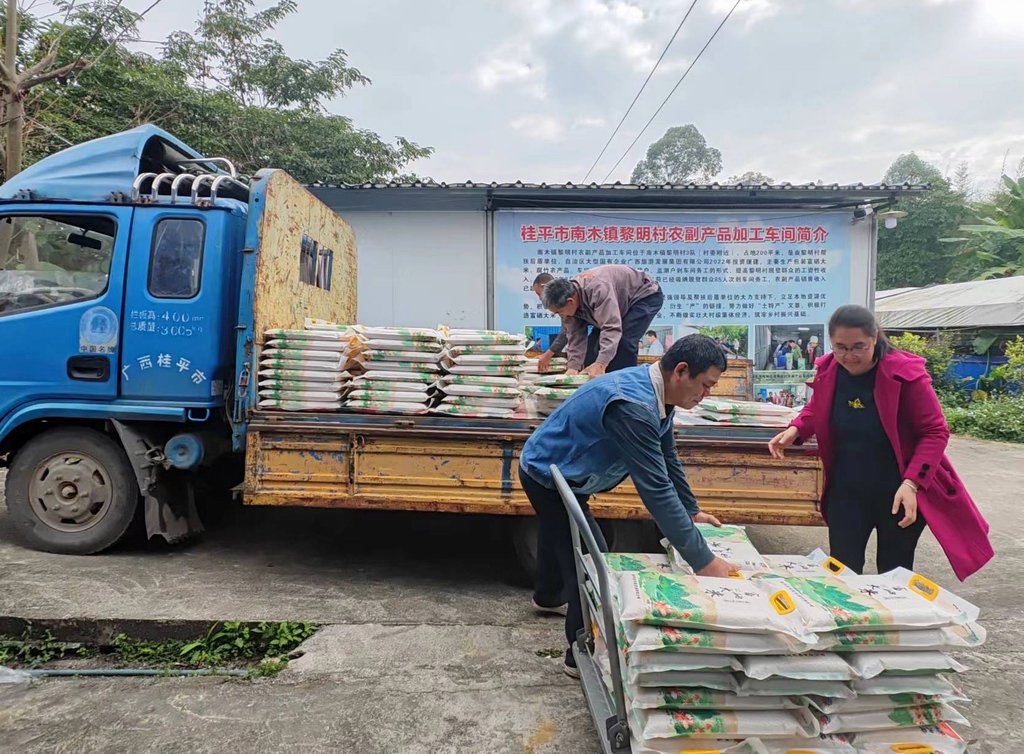 廣西桂平市南木鎮黎明村群眾在將大米裝車。