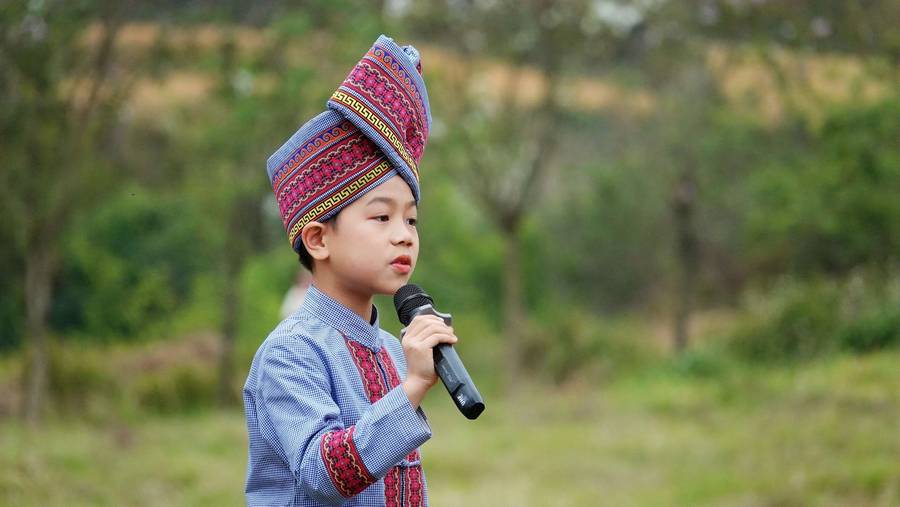 在非遺節目展演環節,來自宜州區的吳恩師,天峨縣的吳昊宇、“廣西二小姐”劉銀鳳、壯鄉阿國和東蘭縣的牙士梁等網紅達人表演了富有民族特色、較高藝術水準、群眾喜聞樂見的文藝節目。東蘭鎮東院小學銅鼓社團的13名學生,一起用173面音樂銅鼓奏響《愛我中華》美妙的旋律,將歌坡節活動推向高潮。