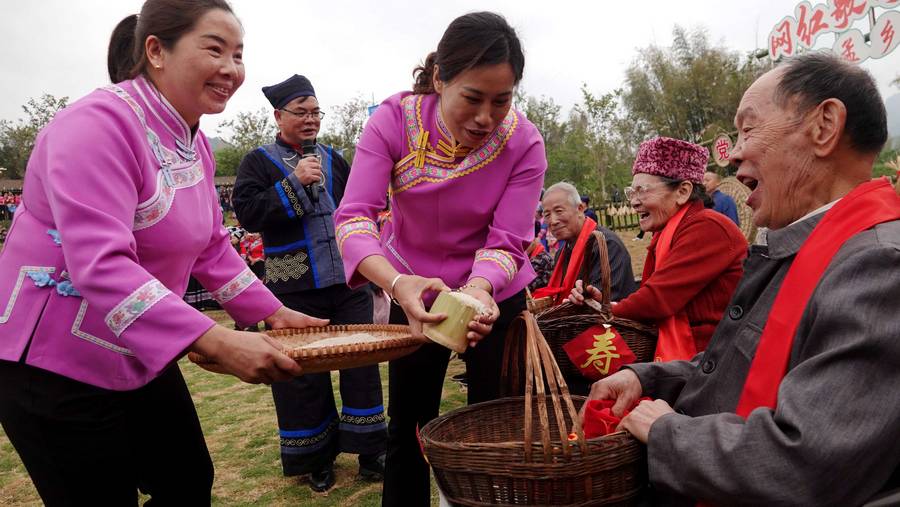 當天的活動分為比學趕超迎春來、補糧增壽同祈福、網紅歌圩鬧春開、歌王爭霸迎豐收四個篇章。其中,為參加歌坡節活動的長壽老人“補糧增壽”成為一大熱點,現場群眾紛紛為長壽老人獻糧添壽,老人收到后輩的補糧祝福后,又反哺給現場群眾,共同演繹為天下蒼生、為春耕生產祈福的感人畫面。