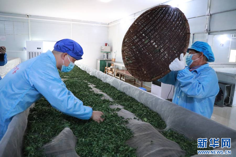 加工廠內,工人將茶葉鋪開進行萎凋。羅俏攝