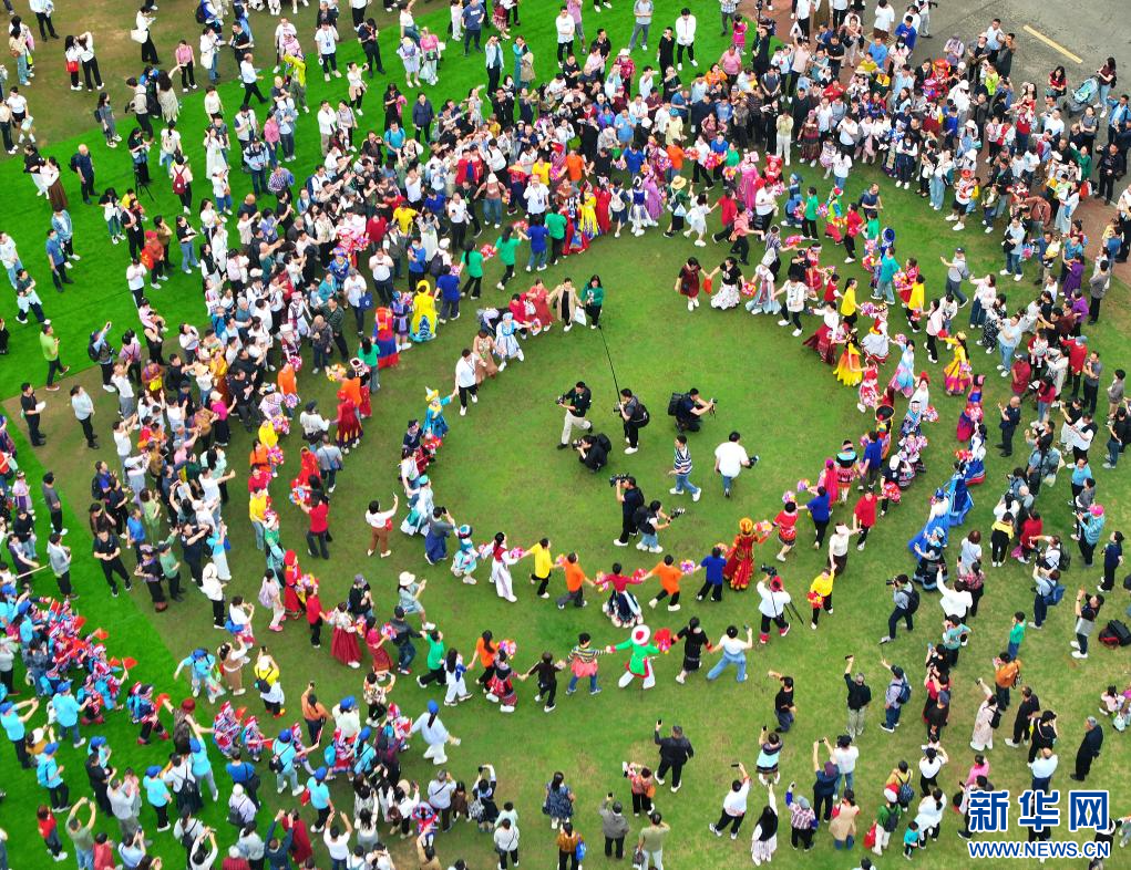 4月11日,群眾在廣西南寧市青秀山主會場跳舞慶祝(無人機照片)。
