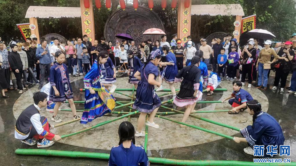 4月11日,廣西欽州市欽北區貴臺鎮洞利村群眾在跳竹竿舞,慶?!叭氯眰鹘y佳節(無人機照片)。