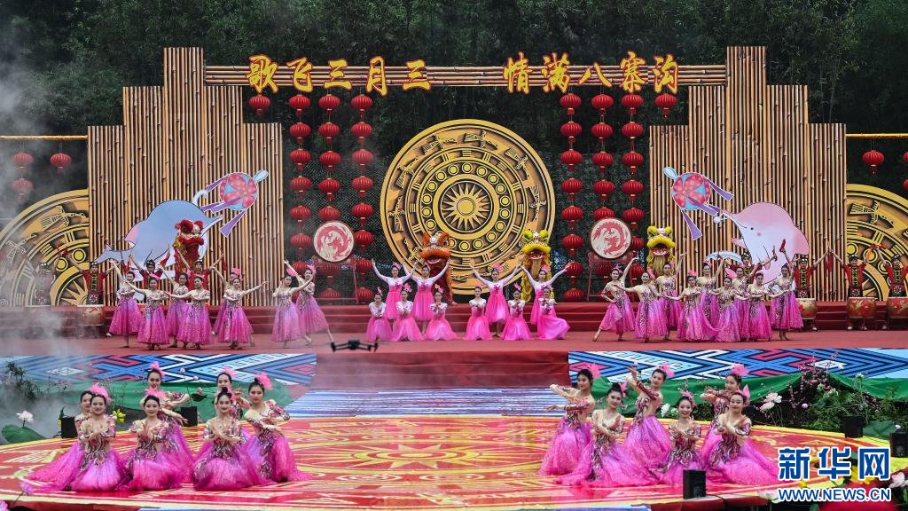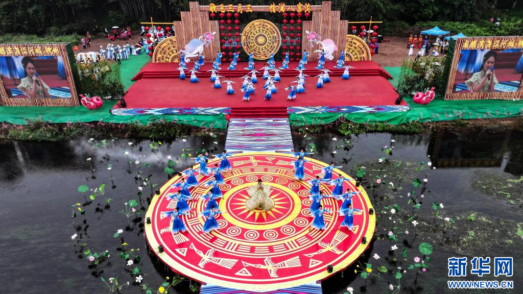 4月11日,廣西欽州市在欽北區貴臺鎮八寨原鄉洞利江邊舉辦實景演出活動,慶?!叭氯眰鹘y佳節(無人機照片)。