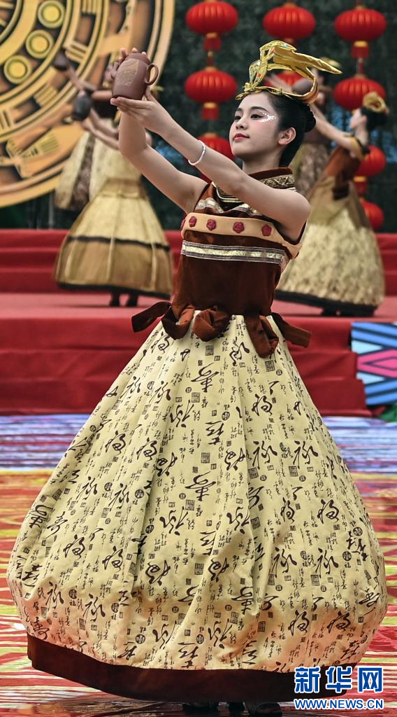 4月11日,在廣西欽州市慶?!叭氯钡膶嵕把莩霈F場,演員在展示欽州坭興陶藝品。