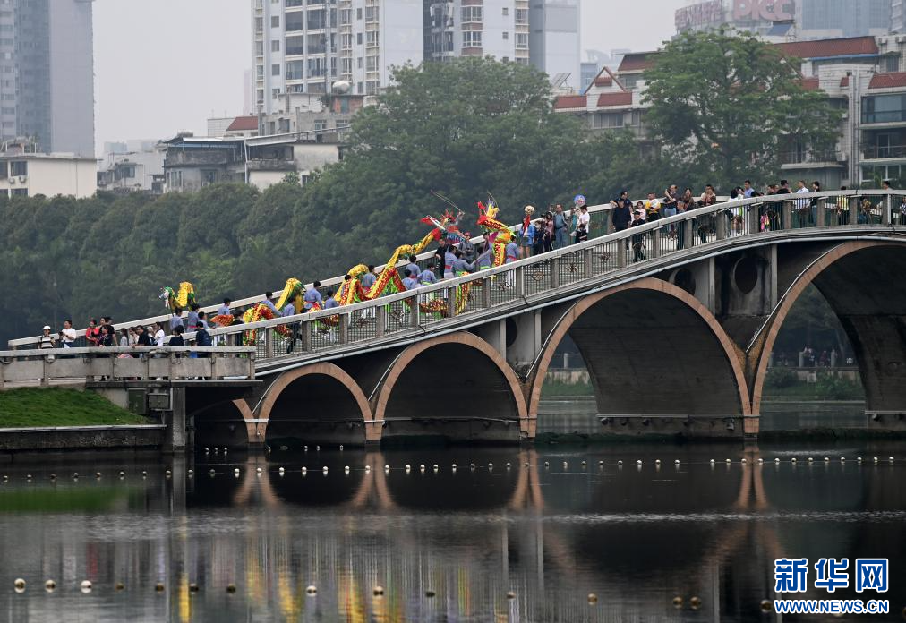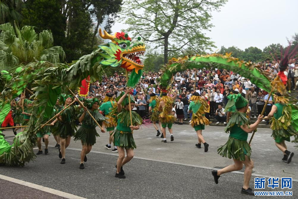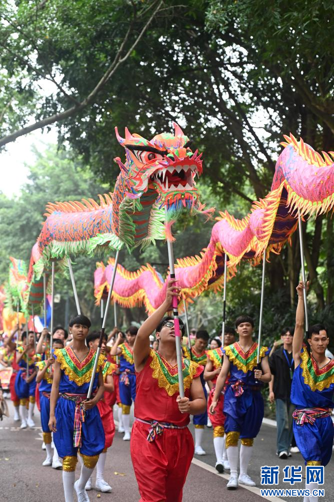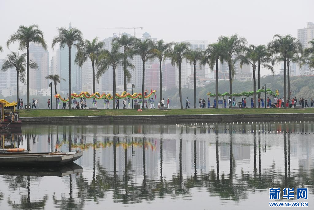 4月12日,舞龍隊在廣西南寧南湖公園巡游。