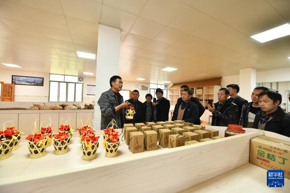 在融安縣東起鄉銅板屯,村民龍飛任(左一)向融水苗族自治縣桿洞鄉烏英苗寨的村民們介紹產業發展情況(2021年2月18日攝)。