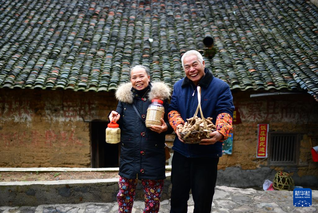 75歲的龍展星(右)和老伴在村口展示特產(2019年3月9日攝)。