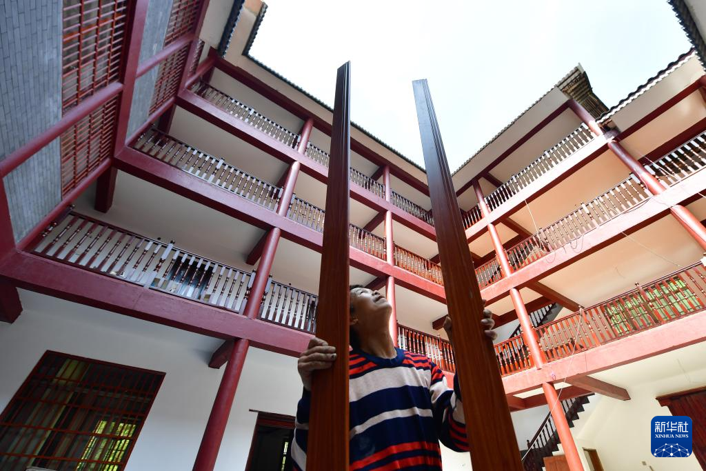 銅板屯村民龍革雄在裝修民宿(2020年4月12日攝)。