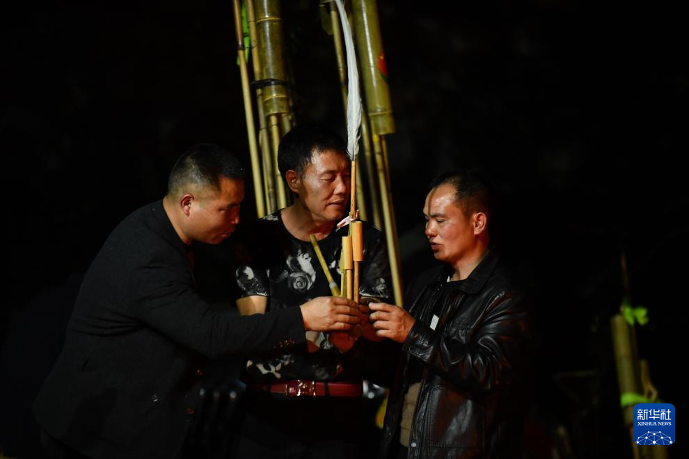 在融安縣東起鄉銅板屯,村民龍飛任(中)在融水苗族自治縣桿洞鄉烏英苗寨村民吳新仁(右)的指導下,學習吹蘆笙(2021年2月18日攝)。