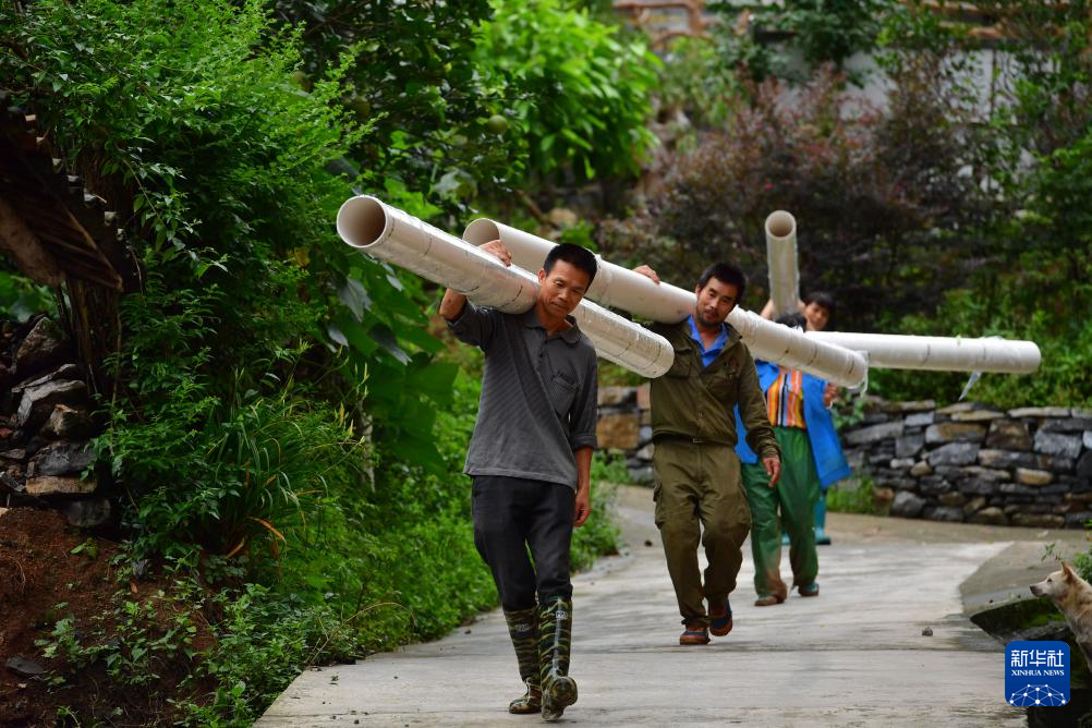 龍革雄(前)和村民一起搬運雨污分流工程水管(2017年8月15日攝)。