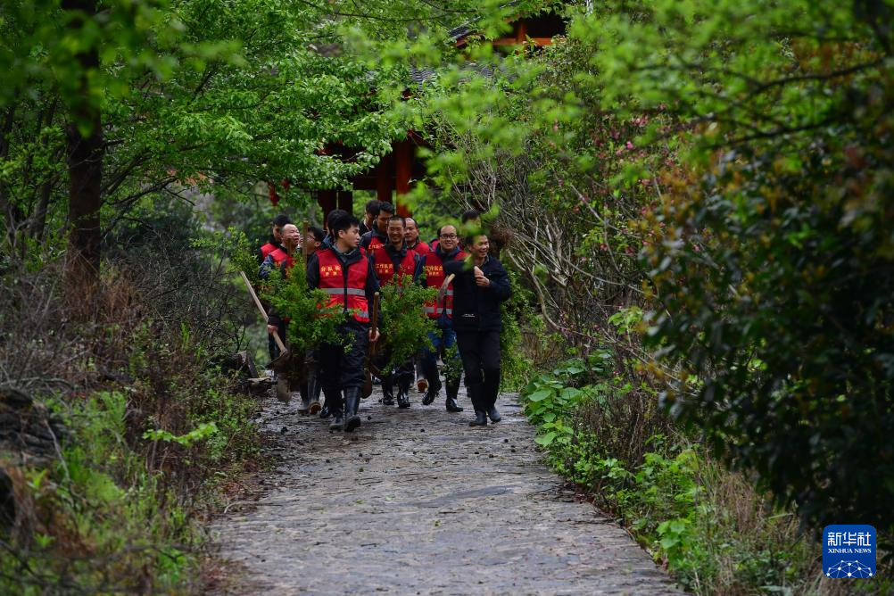 銅板屯村民龍革雄(右一)和駐村工作隊隊員一起上山種樹(2021年3月11日攝)。