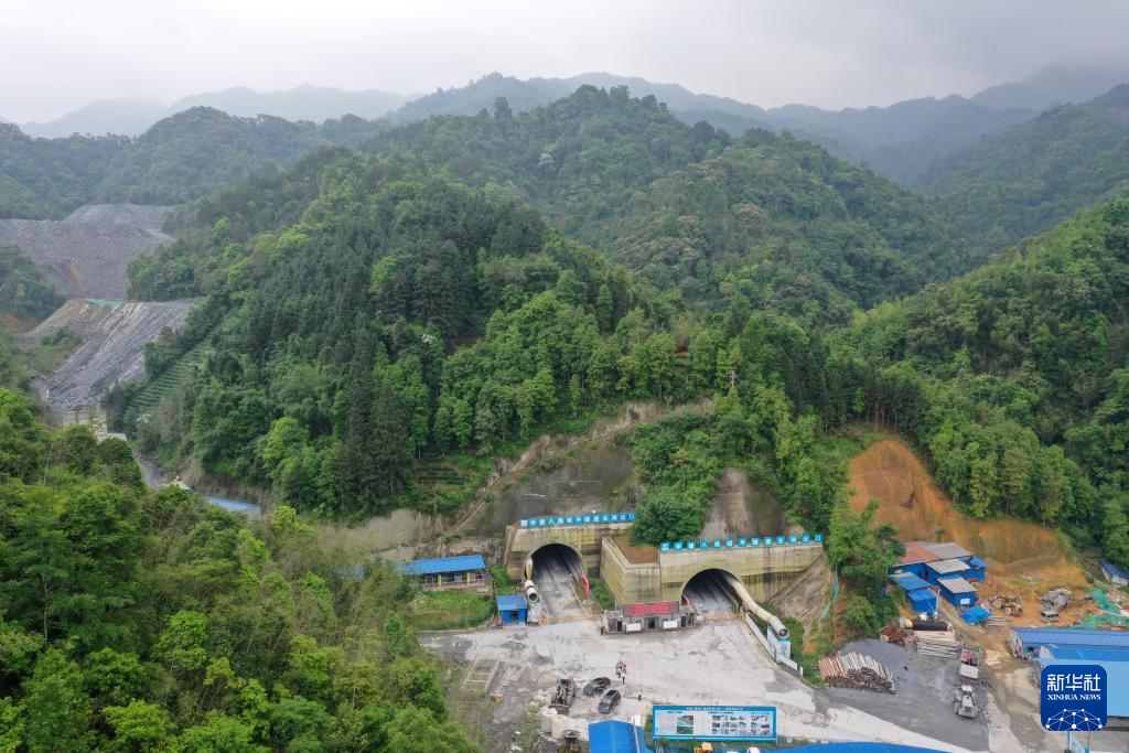 這是廣西昭平縣境內正在建設的蒼昭高速公路隧道(4月25日攝,無人機照片)。