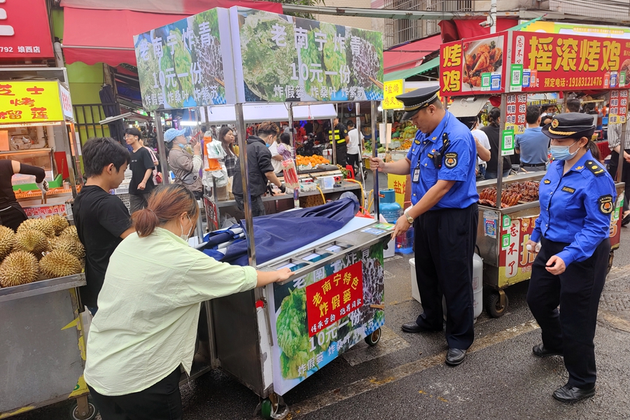青秀區從今年3月起,組織街道、城管、市場監管、住建、衛健、公安、交警、消防等部門對夜市開展持續集中聯合整治。同時,決定設立埌西夜市街,引進廣西晟大投資管理有限公司開展專業管理和運營,實現臨時市場向正規化、有序化、特色化轉變。