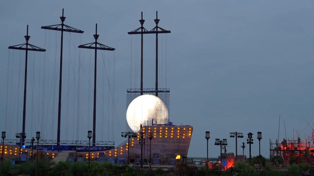 夜幕降臨,北部灣畔,一座“漁港”華燈初上,點亮了這里的雕欄玉砌。傍晚六點,西班牙姑娘克勞迪婭換上了頗具西域風情的服裝,開始了她今晚的演出??藙诘蠇I參演的戲劇,講述了兩千多年前廣西合浦這座海上絲綢之路早期始發港的故事。