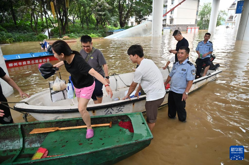 6月18日,在廣西柳州市濱江西路,民警用沖鋒舟接送居民。