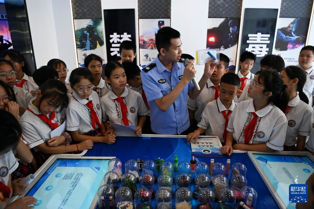 6月21日,在廣西禁毒教育示范基地,公安民警為學生們進行禁毒知識宣傳。
