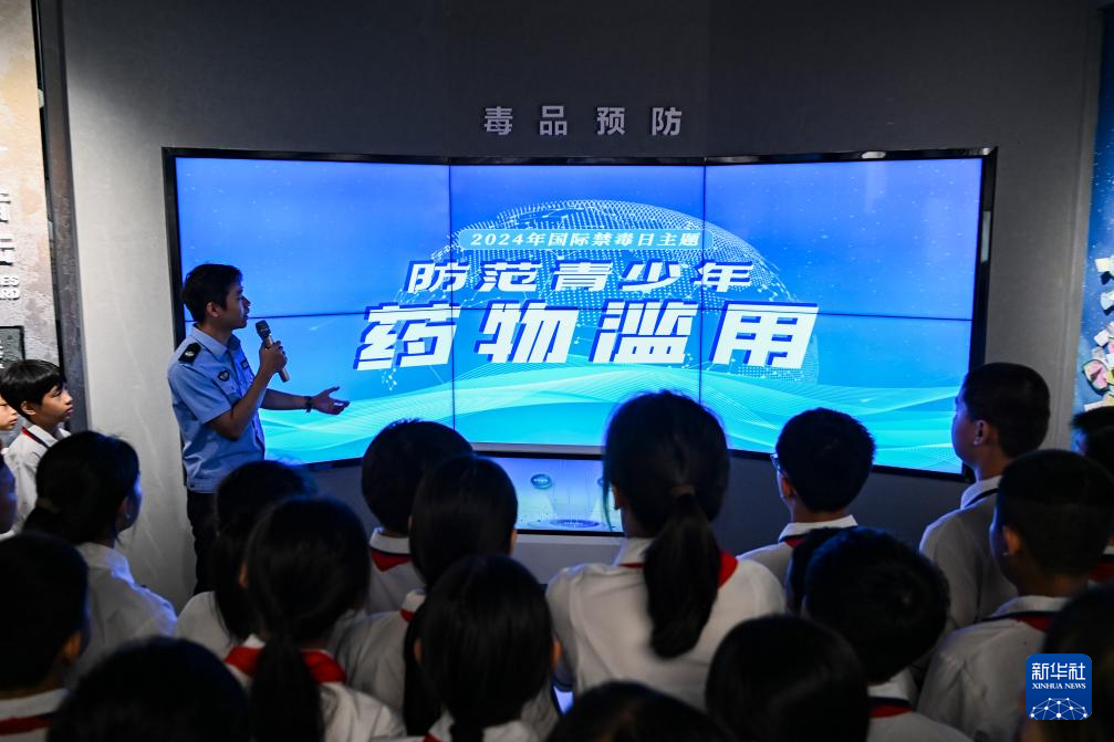 在第37個國際禁毒日來臨前,廣西興業縣分批組織中小學生走進位于當地的廣西禁毒教育示范基地,通過觀看禁毒宣傳視頻、VR體驗、識別仿真毒品模型等形式,讓學生們認識毒品的種類、危害,提高中小學生對毒品的防范意識。