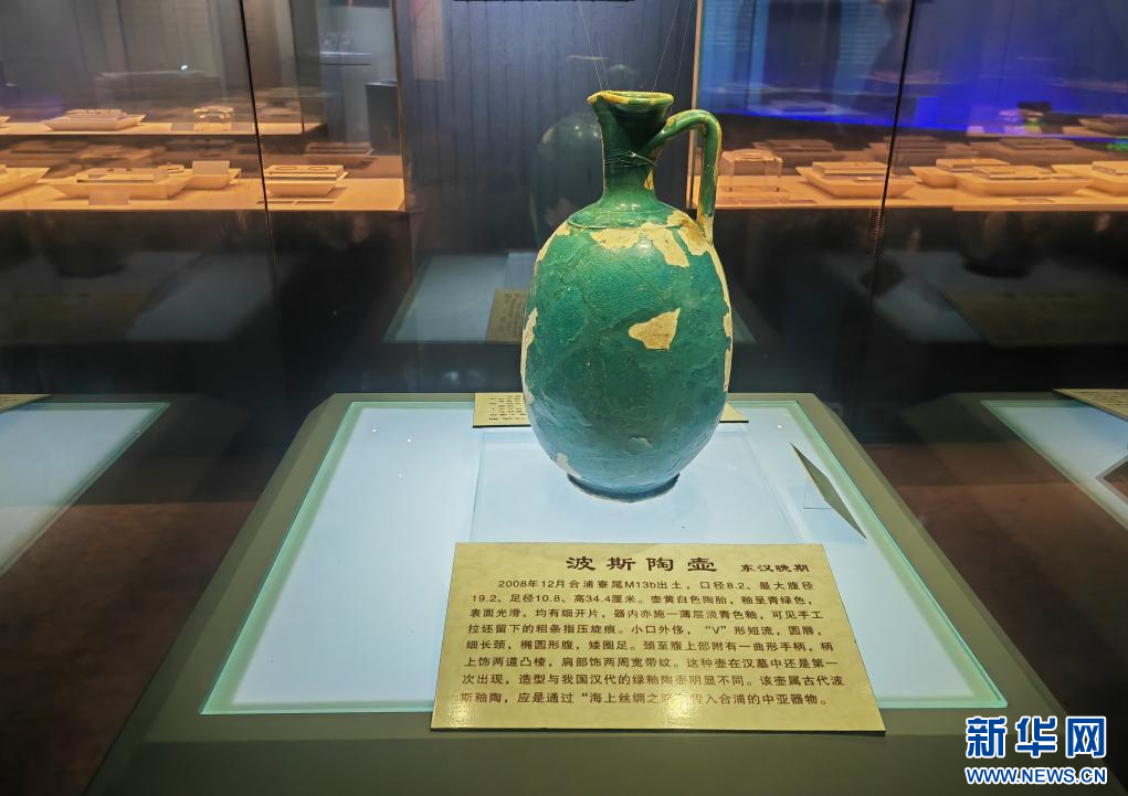 在二樓展廳展出的波斯陶壺,是合浦漢代文化博物館的鎮館之寶。這尊身著青綠盛裝的陶壺在聚光燈下耀眼奪目,是漢王朝與波斯帝國交往的重要物證。