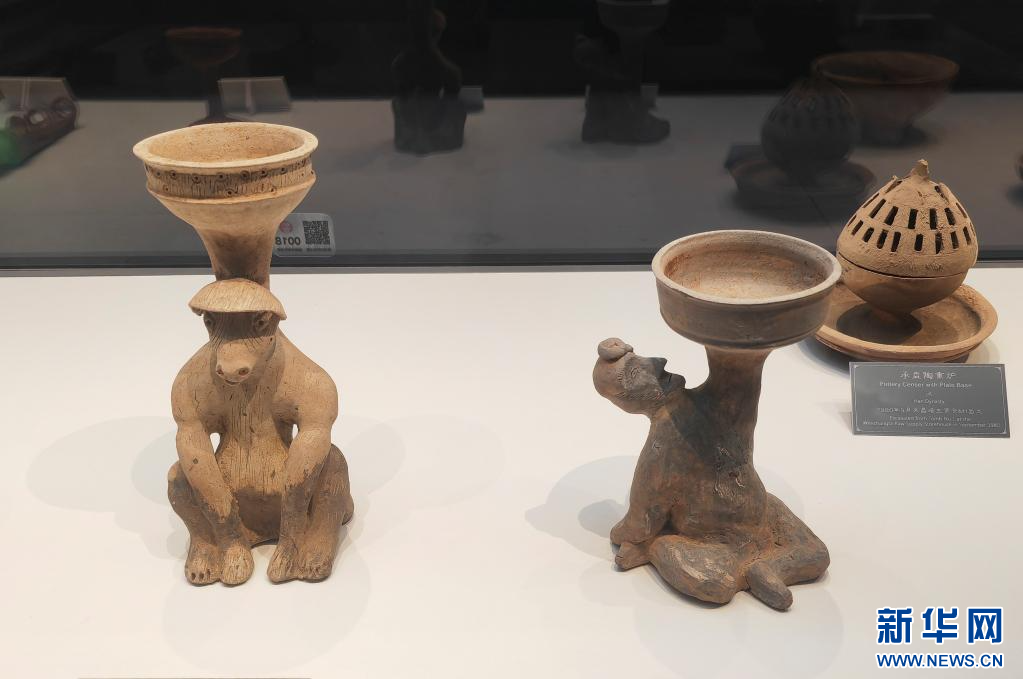 6月19日,在廣西合浦漢代文化博物館展出的東漢馬座陶燈和胡人俑座陶燈等文物。新華社記者 黃浩銘 攝